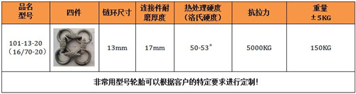 保養(yǎng)鏈耐磨性好,抗疲勞性強(qiáng),根據(jù)使用條件壽命達(dá)3000-8000小時(shí)。拆裝方便,省時(shí)省力,產(chǎn)品規(guī)格齊全,可與進(jìn)口裝載機(jī)所匹配,輪胎保護(hù)鏈,采用高科技耐磨材料制成其結(jié)構(gòu)新穎緊湊,性能穩(wěn)定,主要適用于礦山作業(yè)的裝載機(jī),其輪胎磨損快,使用壽命短,輪胎價(jià)格昂貴,使用成本高,將本產(chǎn)品嚴(yán)密的包裹在裝載機(jī)的輪胎上,可以有效的保護(hù)裝載機(jī)的輪胎,不被尖銳的石塊劃傷刺破,延長(zhǎng)了輪胎的使用壽命,使用一條輪胎保護(hù)鏈,能節(jié)省十條輪胎以上的費(fèi)用還能提高裝載機(jī)的工作效率和安全是礦山作業(yè)的必備品。